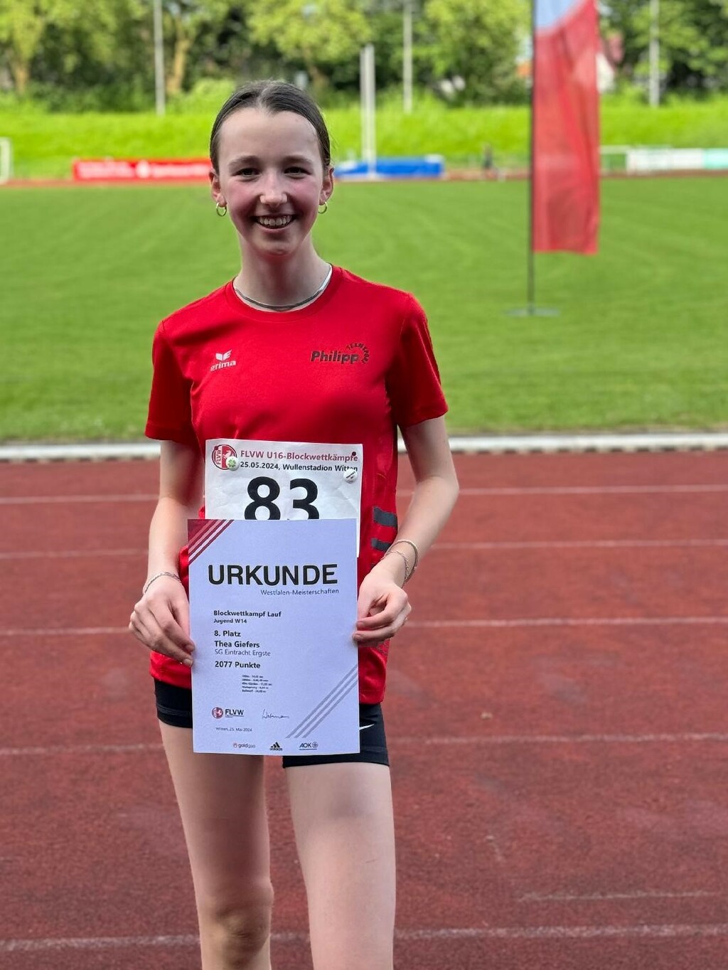 Ihre zwei Jahre ältere Schwester Thea Giefers wusste mit einem ausgeglichenen Vierkampf zu überzeugen. Dabei stellte sie über 75m (11,10s) und im Wurf mit dem 200g schweren Ball (22,5m) neue Bestleistungen auf, im Hochsprung (1,20m) stellte sie diese ein und sicherte sich zusammen mit dem Weitsprung (4,06m) mit 1495 Punkten die Vizemeisterschaft. Ihre gleichaltrige Vereinskameradin Kate Fischer belegte mit 1260 Punkten (12,81s, 25,5m, 1,08m, 3,69m/PB) den achten Rang. W12-Athletin Zoe Timusk zeigte ebenfalls teils sehr gute Leistungen und stellte in ihrem Vierkampf gleich drei neue Bestleistungen (75m in 11,02s, Ballwurf 17m und Hochsprung mit starken 1,29m) auf. Da sie im Weitsprung jedoch nur auf 3,23m kam, musste sich die Ergsterin mit 1398 Punkten und der Bronzemedaille begnügen.