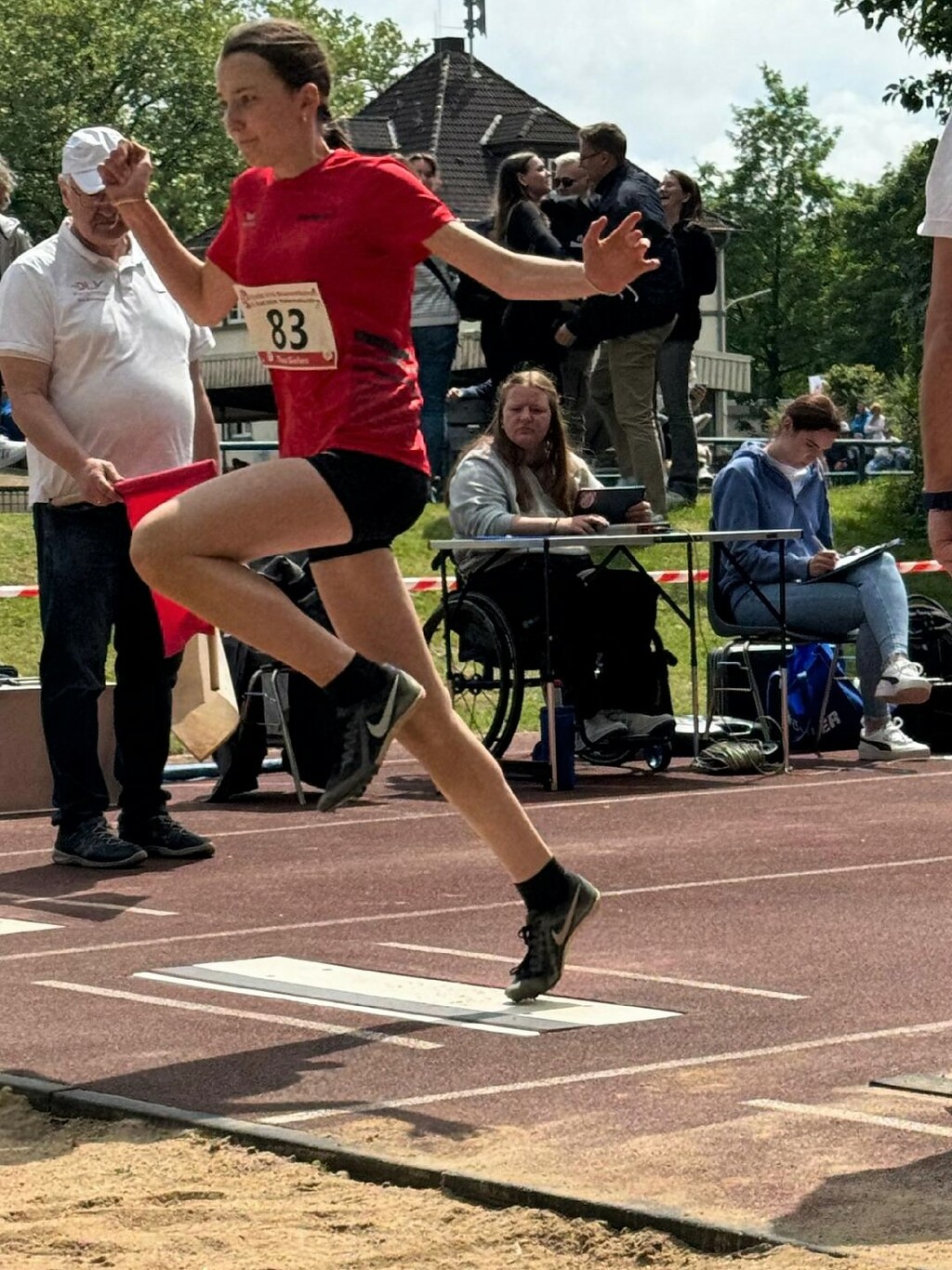 Die ein Jahr jüngere Zoe Timusk lieferte sich über 800m ein überaus spannendes Rennen mit einer Konkurrentin aus Herdecke und sicherte sich erst auf den letzten Metern den Sieg in sehr guten 2:51,16min. Im Hochsprung wurde sie mit 1,20m Fünfte. Mit guten Leistungen wartete auch die Altersgruppe der W10 auf. Klara Giefers teilte sich ihren Lauf über 800m optimal ein und überquerte nach 3:05,92min als Erste die Ziellinie. Im Hochsprung (1,00m) musste sie sich dagegen mit der Silbermedaille „begnügen“. Ihre Vereinskameradin Lelia Kotthoff kam im gleichen Wettbewerb ebenfalls mit der Sprunghöhe von einem Meter auf den Bronzerang. Den 80g schweren Schlagball warf Lelia 20m weit (4. Platz) und wurde im 50m-Sprint in 8,69sec Fünfte.