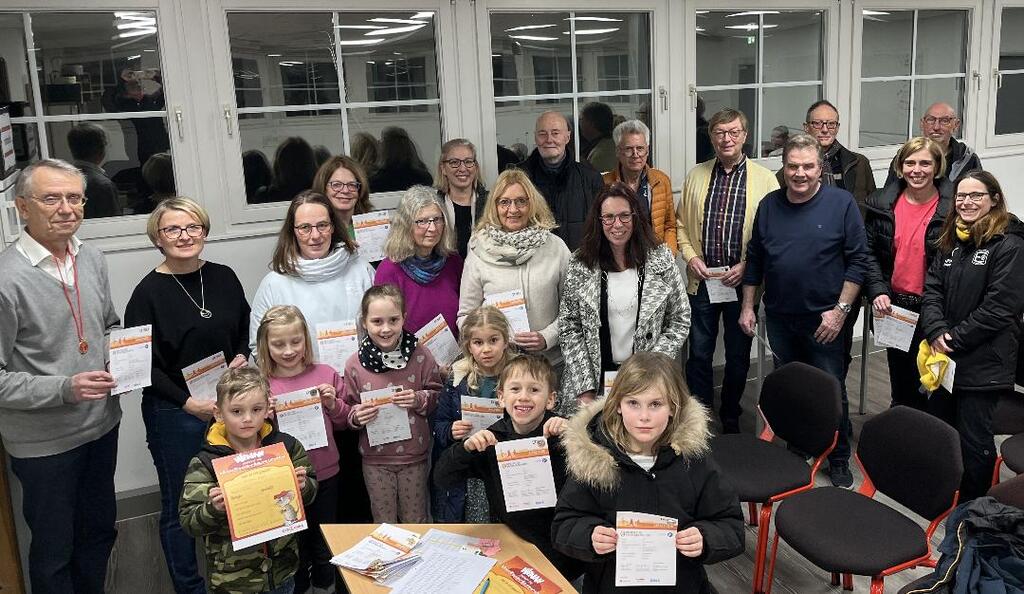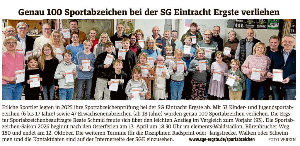 Anfang der Woche fand die Sportabzeichenverleihung der SG Eintracht Ergste statt – erstmals in der Ergster Mitte. Beate Schmid (hintere Reihe 2. v.l.), die Sportabzeichenbeauftragte der SGE, freute sich, nach vierjähriger Pause die Verleihung für 2021 (97 Teilnehmer) und 2022 (77 Teilnehmer) vornehmen zu können – im Vergleich zur Vorcoronazeit mit rund 140 Sportabzeichen ein Rückgang um beinahe 50 Prozent. Schmid hofft, dass sich nun wieder mehr Sportler im Waldstadion „Zuhause“ am Bürenbrucher Weg 180 in Ergste einfinden, um für das Sportabzeichen zu trainieren. Bis zum 25.09.2023 kann jeder Athlet auch ohne Vereinszugehörigkeit montags von 18.30 bis 20 Uhr die Prüfung in den leichtathletischen Disziplinen ablegen. Bei Rückfragen bitte unter beateschmid@freenet.de melden. kos