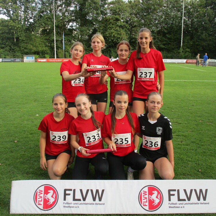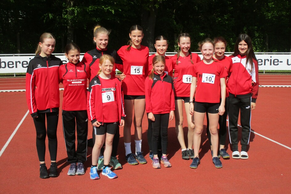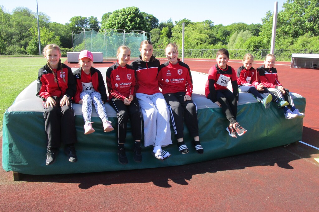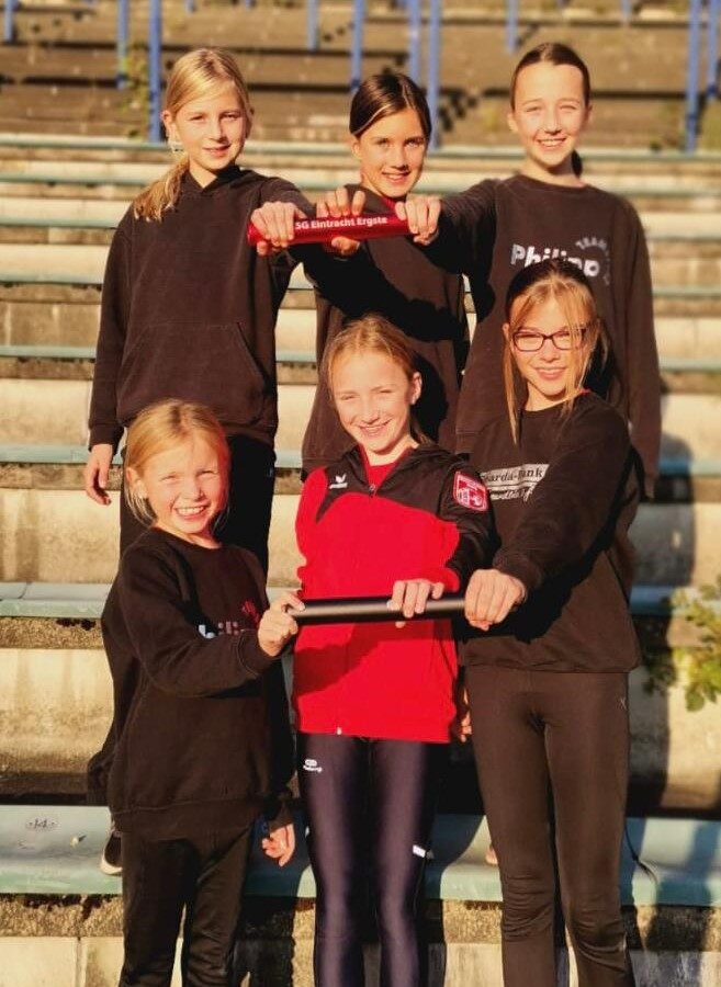 Bei optimalen äußeren Bedingungen startete der Leichtathletiknachwuchs der SG Eintracht Ergste am vergangenen Sonntag beim Kinderleichtathletik-Cup des VfL Bochums. Im Schatten des Ruhrstadions wusste das Team der U12 bei den Sprintdisziplinen zu überzeugen. Sowohl die 50m flach als auch den 50m Hindernissprint über Bananenkisten und die 6x50m-Staffel entschieden Klara Giefers, Charlotte Klagholz, Lelia Kotthoff, Ida Rabiega, Cara Schulz, Juna Tekhaus und Zoe Timusk für sich. In der selten angebotenen Disziplin des Stabweitsprungs zeigte sie ebenfalls gute Leistungen und kamen auf den zweiten Platz. Einzig im Drehwurf, einer Vorstufe zum Diskuswurf, schwächelten die Athletinnen ein wenig und belegten lediglich den dritten Rang. Groß war der Jubel aber, als sie die Gesamtwertung gemeinsam mit dem Gastgeber gewinnen konnten.