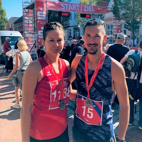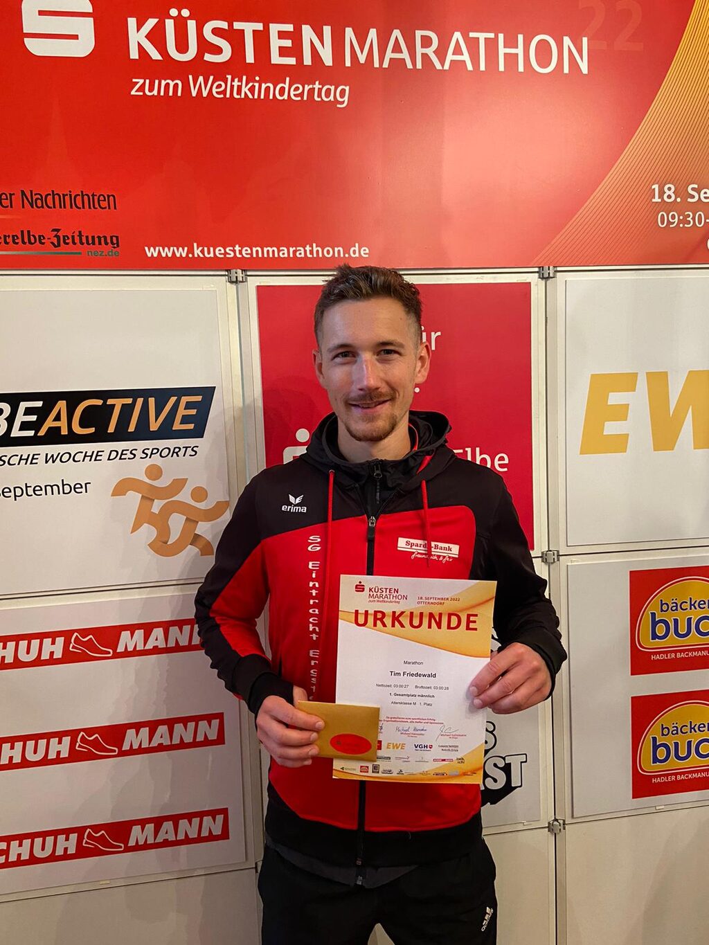 Tim Friedewald, Leichtathlet der SG Eintracht Ergste, nutzte seinen Urlaub, um am vergangenen Sonntag beim 22.Küstenmarathon in Otterndorf/Niedersachen zu starten. Begleitet wurde die gut organisierte Veranstaltung im Zusammenhang mit dem Weltkindertag unter anderem von Pamela Dutkiewicz-Emmerich, Bronzemedaillengewinnerin über die 100m Hürden bei den Weltmeisterschaften 2017 in London, die im Vorfeld einen Vortrag mit dem Thema „Performen, wenn’s drauf ankommt“ hielt und dem aus dem Fernsehen bekannten Sportreporter Norbert König (ZDF), der den Marathon moderierte.
