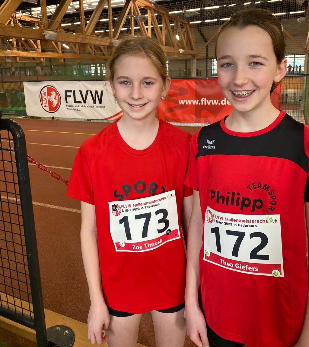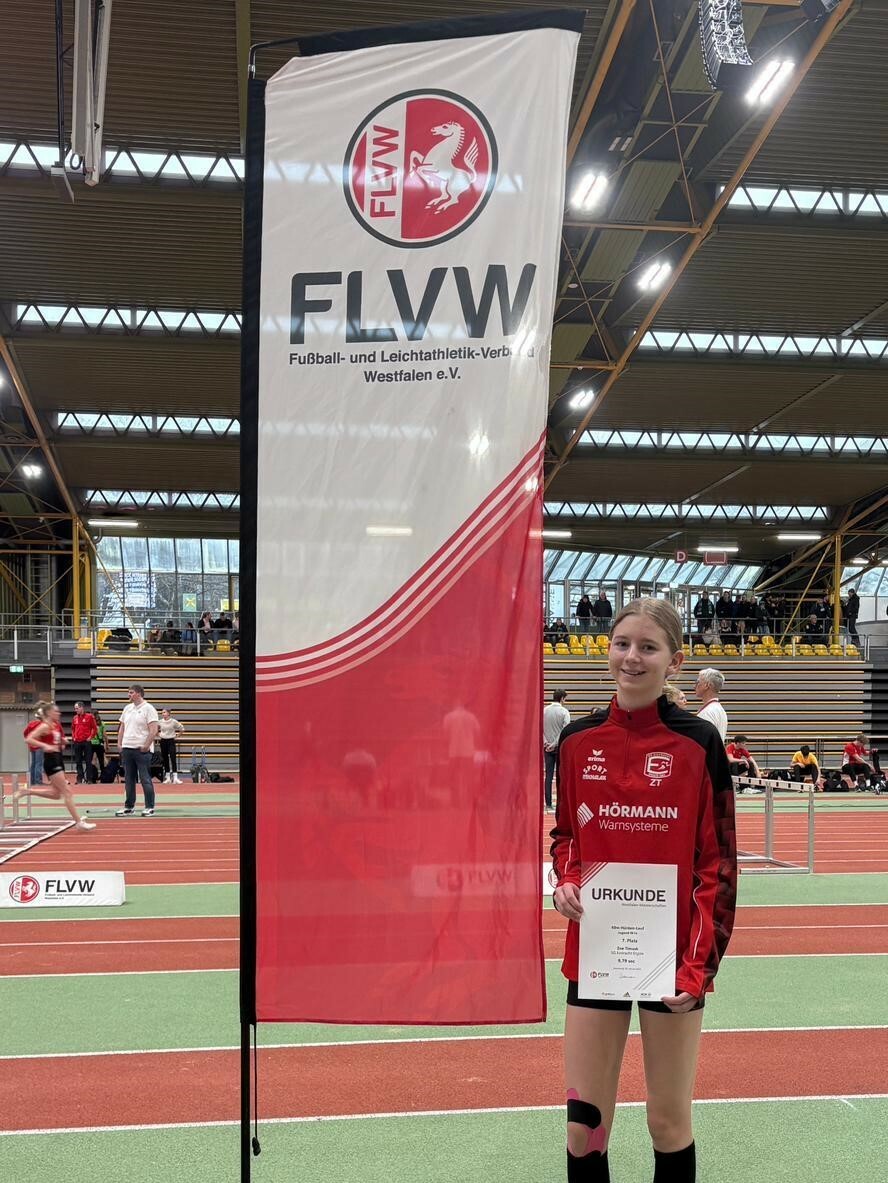 Am vergangenen Sonntag fanden in Paderborn die Westfälischen Leichtathletikmeisterschaften der Altersklasse U14 statt. In der Halle im Ahorn-Sportpark war auch die SG Eintracht Ergste mit zwei Athletinnen vertreten. Dabei zeigten Thea Giefers und Zoe Timusk einmal mehr ihr Mittelstreckentalent über 800m. W13-Athletin Giefers überzeugte mit einer kämpferischen Leistung, hielt bis ins Ziel den Kontakt zur Führungsgruppe und belegte in ausgezeichneten 2:37,71min den fünften Platz. Damit blieb die Ergsterin erstmals unter 2:40min und verbesserte ihre Bestleistung gleich um über fünf Sekunden.