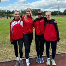 Mit einem jungen Team trat die U16-Staffel über 4x100m an. Kate Fischer, Thea Giefers, die sich gut erholt vom 800m-Rennen mit einem starken Lauf auf der Gegengeraden zeigte, Cara Schulz und Ida Rabiega – die beiden letztgenannten Athletinnen sind noch für die U14-Altersklasse startberechtigt, wussten mit guten Wechseln zu überzeugen und kamen mit Saisonbestleistung von 54,19sec auf den 16. Rang.