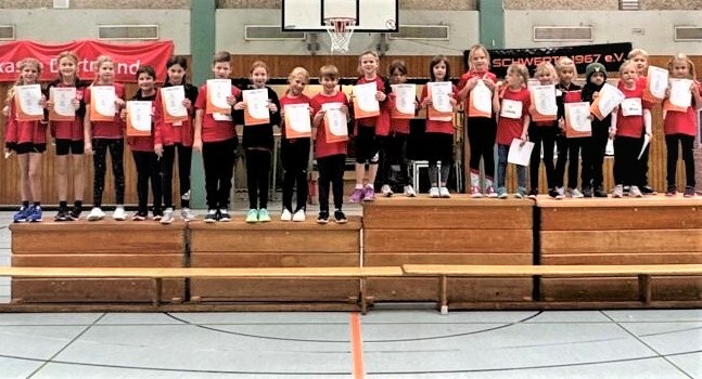 Die Athleten übten sich im 30m-Sprint, dem Ziel-Weitsprung, dem Drehwurf mit einem Ring sowie der Team-Biathlon-Staffel über 3x400m. Die Ergster waren konzentriert bei der Sache und zeigten, dass sie nicht zum ersten Mal bei einem solchen Teamwettbewerb starteten. So wusste die Mädchenmannschaft mit Hannah Stiegelbauer, Elina Pferdekämper, Naya Pröpper, Hannah Gerling, Eleanor Brauckmann und Hanna Tervoort läuferisch zu überzeugen, während das männliche Team mit Noah Dreher, Jona Schepers, Leonhard Graf, Milan Schnarbach, Simon Mexner und Mats Borrotzu im Wurf die Nase vorn hatte. Am Ende freuten sich die jungen Sportler über die Silbermedaille (Mädchen) sowie den Bronzerang (Jungen).