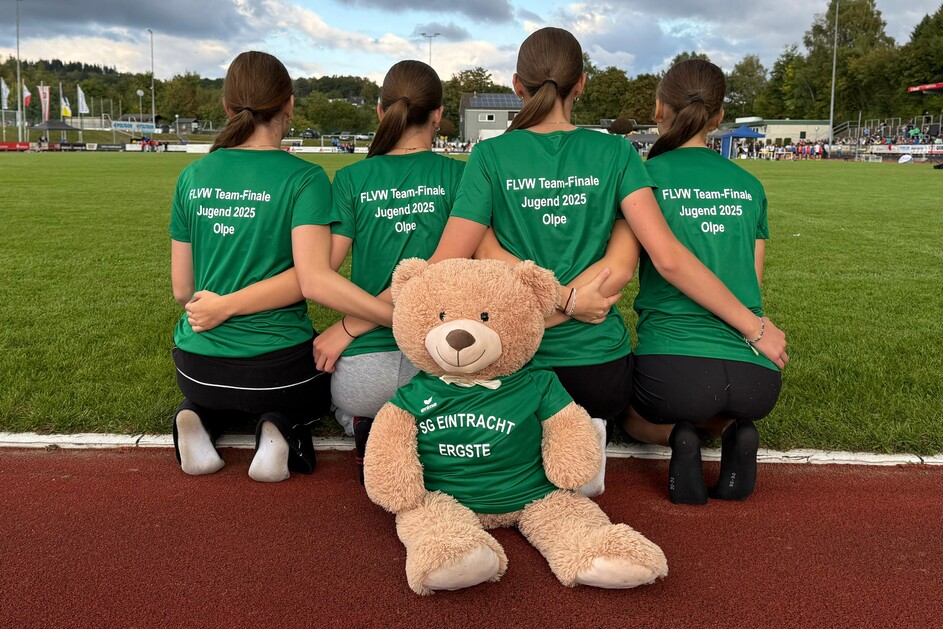 Zum Ende der Freiluftsaison starteten die U14-Leichtathletinnen der SG Eintracht Ergste am vergangenen Wochenende beim FLVW Team-Finale Jugend im Olper Kreuzbergstadion. Die Ergster hatten sich im Vorfeld als Dritte qualifiziert und wollten diesen Platz trotz eines Rumpfteams mit nur vier Sportlerinnen bestätigen. Diese Hoffnungen musste die SGE allerdings schon nach der ersten Disziplin, der 4x75m-Sprintstaffel, begraben. Das Quartett in der Besetzung Juna Tekhaus, Lelia Kotthoff, Cara Schulz und Ida Rabiega verlor den Staffelstab und verbuchte daher statt der eingeplanten 900 Punkten und mehr null Punkte. Da war natürlich Aufbauarbeit seitens der SGE-Trainerin Sabrina Csigi gefragt, die u.a. darauf hinwies, dass selbst bei der Leichtathletik-WM in Tokio Medaillenkandidaten wie Großbritannien oder Jamaika bei den Männern den Stab nicht ins Ziel gebracht hätten. Nach einem „aufmunternden“ Tanz ging es dann weiter.